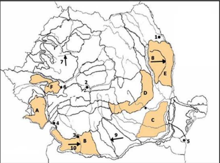 a) Regiunea subcarpatica alcatuita din 2 aliniamente de dealuri si doua aliniamente de depresiuni este marcata pe harta cu litera…………………..
