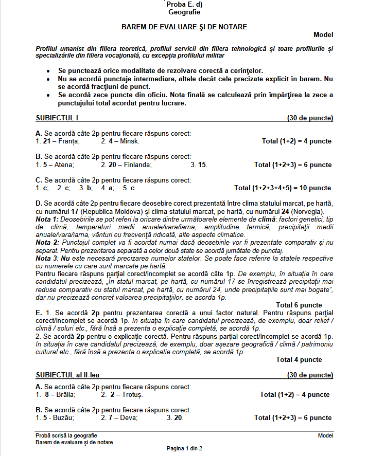 - Subiectul I – itemi de localizare și identificare pe hartă, cu punctaj acordat pentru fiecare element corect menționat;